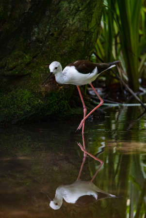 Black-winged stilt walking reflected in the water of a pond in the shade of some trees, image of a bird of the avocet family