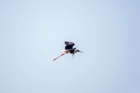 Water bird black-winged stilt flying in the blue sky. The black-winged stilt, lat. Himantopus himantopus, is a widely distributed very long-legged wader in the avocet and stilt family