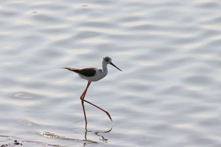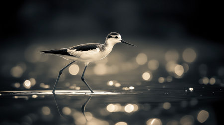solitary black-winged stilt elegantly strides through shallow water, its distinctive black-and-white plumage reflecting the serene environment around it, creating a tranquil atmosphere.