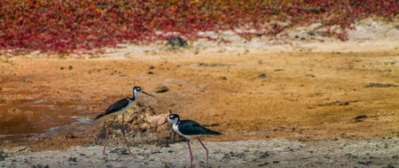 The black-necked stilt (Himantopus mexicanus) foraging at the wetlands of Texas South Padre Island.