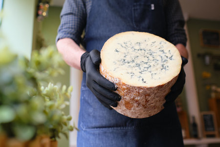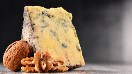 Italian food, buttery or firm blue cheese made from cow milk in Gorgonzola, Milan, Italy close up