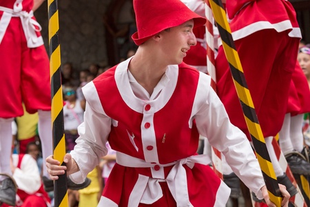 ESCHBORN, GERMANY - AUG 16, 2013: people on stilts perform Romeo and Juliet wearing carnival costumes in Eschborn, Germany. The summertime festival is a yearly event in Augusr.