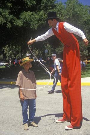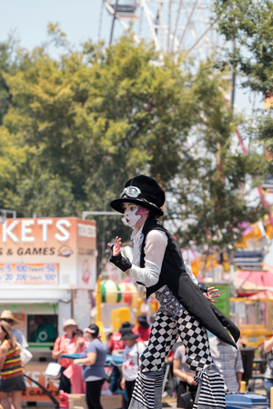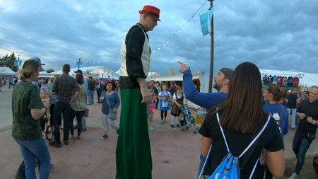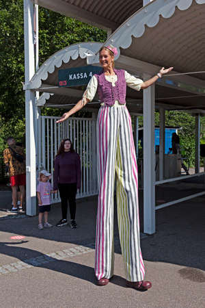 Gavle, Norrland Sweden - July 10, 2021: entertainer walking on stilts outside the amusement park