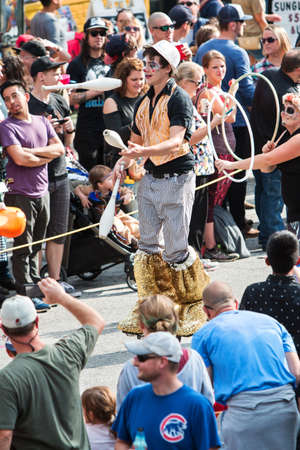 Atlanta, GA, USA - October 15, 2016: A man on stilts juggles juggling pins while walking along the parade route of the annual Little Five Points Halloween parade, on October 15, 2016 in Atlanta, GA.