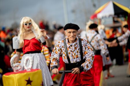 LOULE, PORTUGAL - FEB 2018: Colorful Carnival (Carnaval) Parade festival participants on Loule city, Portugal.