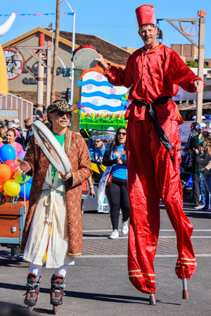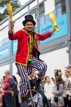 LOULE, PORTUGAL - 17th FEB 2024: Colorful Carnival (Carnival) Parade festival participants in Loule city, Portugal.