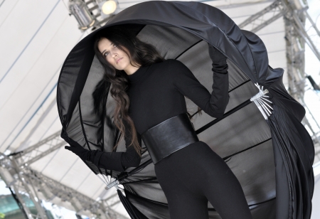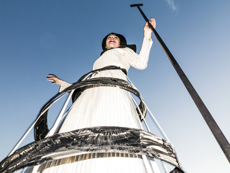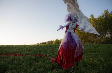 Fairy tale woman on stilts with silver flag in bright fantasy stylization. Fine art outdoor photo.