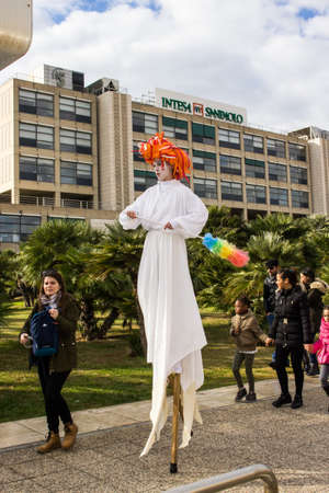 NICE - FRANCE - March 01, 2014: Carnival of Nice, Flowers' battle. An acrobat woman with clown costume