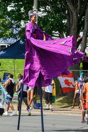 Toronto, ON, Canada - August 5, 2023: Girl walking on stilts down the street during the Toronto's Caribana Parade