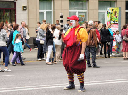Voronezh, Russia - Jun 14, 2014: a man in a clown costume in wide trousers with traffic policeman's baton and citizens at a parade of street theaters on a city street