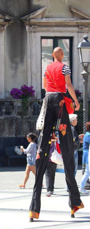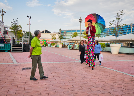 Circus artist with umbrella on stilts in the square, Biella, Italy in July 14, 2018