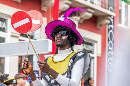 LOULE, PORTUGAL - 17th FEB 2024: Colorful Carnival (Carnaval) Parade festival participants on Loule city, Portugal.