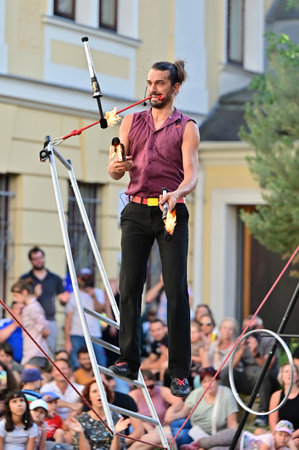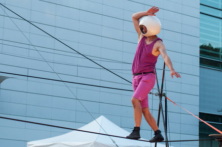 LUBLIN, POLAND- 29 july 2017- slackliner in old town at Urban Highline Festival placed in city space of Lublin - biggest slacklining spectacle in the world