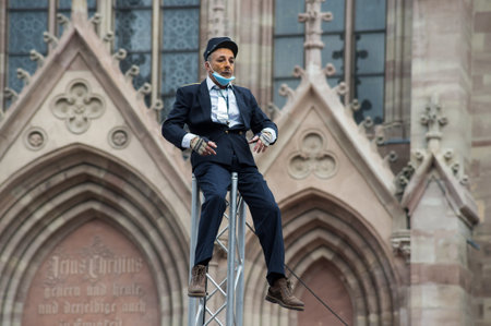 MULHOUSE - France - 15 July 2017 - the artist Johanne Humblet tightrope walker performance during four hours in Mulhouse