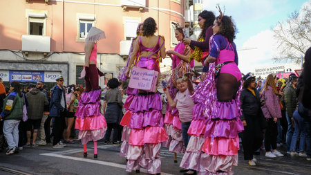 Feb 10, 2024 - Lisbon, Portugal: Stilt walkers in layered pink skirts ready for Colombina Clandestina carnival procession. People gather on a city street for parade on sunny day.