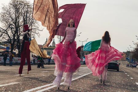 September 15, 2018 Minsk Belarus Half Marathon Minsk 2019 People on stilts with flags show circus performance before start.