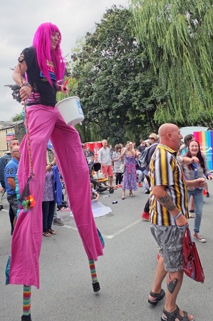 Hebden Bridge, West Yorkshire, England - August 11 2018: a woman with pink hair on stilts and people dancing at the happy valley pride event in hebden bridge