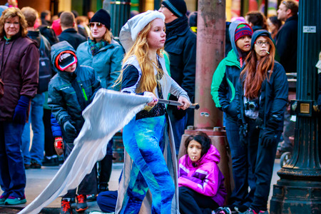 Portland, Oregon, USA - November 27, 2015: Hillsboro High School Marching Band in the annual My Macy's holiday Parade across Portland Downtown.
