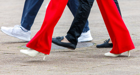 Three people walking down a sidewalk, one of whom is wearing red pants and white shoes. The other two people are wearing black pants and white shoes