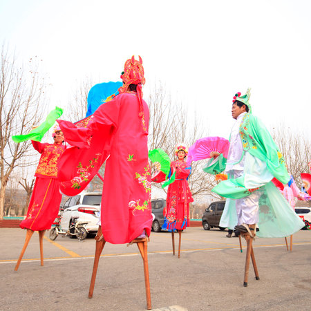 Fengnan County- February 26: Chinese traditional style yangko folk dance performance in the street, on February 26, 2017,Fengnan County, hebei Province, China