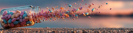 Colorful candies are spilling from a glass jar onto a sandy surface, creating a vibrant scene with a blurred sunset background, evoking feelings of joy and indulgence