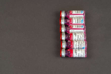 Animal rabies vaccine Biocan R from Bioveta is on gray. Six new ampoules with pink medicine inside. Rabies prophylaxis. Veterinary medicine. Inscriptions in Ukrainian. Kiev, Ukraine - April 24, 2021