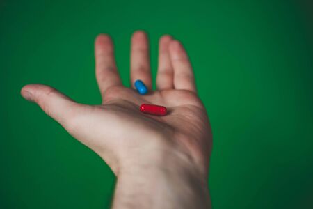 Pills in blue and red capsules, close-up, background