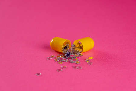 Creative layout of open pill with little stars. Macro shot
