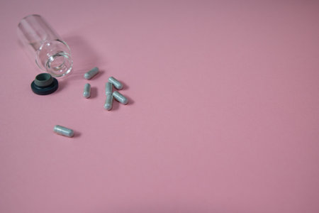 Glass vial with black stopper is placed on pink surface, surrounded by gray capsules, showing pharmaceutical elements and health-related themes