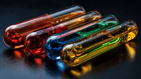 A collection of four vibrant test tubes filled with colorful liquids, showcasing a range of hues against a sleek black background, ideal for science-themed visuals.