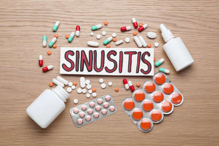 Card with word Sinusitis, drops, nasal spray and pills on wooden table, flat lay