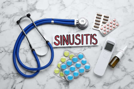 Card with word SINUSITIS, stethoscope, non-contact thermometer and different drugs on white marble background, flat lay