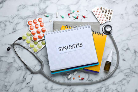 Notebook with word SINUSITIS, stethoscope and different drugs on white marble background, flat lay