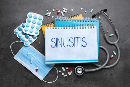 Notebook with word SINUSITIS, stethoscope, medical mask and different drugs on gray stone background, flat lay
