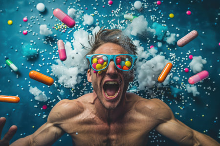 A colorful assortment of pills scattered on a table. The pills are of various shapes and sizes, and they are all mixed together. Concept of chaos and disorder