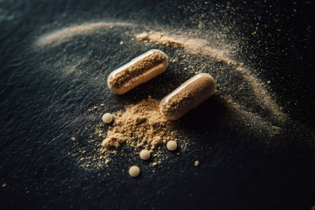 Two transparent capsules containing medicine granules are spilling their content on a dark surface, with some small pills nearby