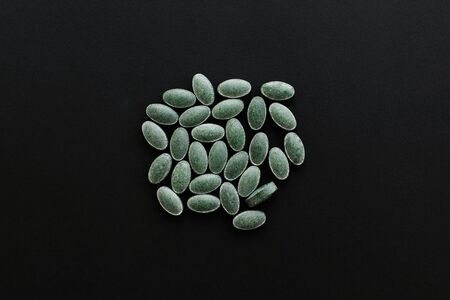 Chlorophyll tablets on black dark background. Flat lay. Dietary supplements. Health support and treatment. Biologically active additives. Detox pills