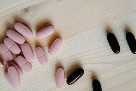 Capsules on a wooden background. Selective focus.