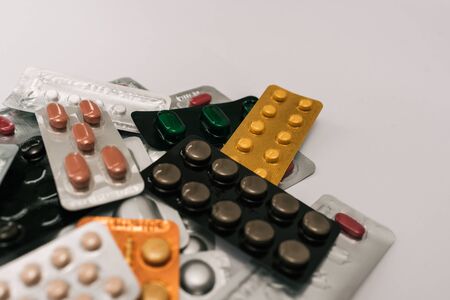 Stock photo of a bunch of tablets in colored blister packaging. There is nobody on the picture.