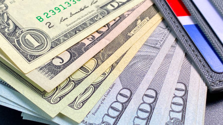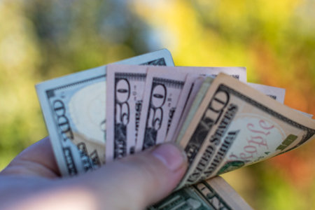 Selective focus on detail of USD banknotes. Counting or giving United States Dollars banknotes. World money concept, inflation and economy concept