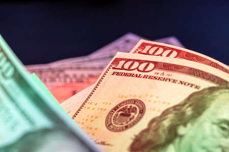 Selective focus on detail of dollars banknotes. Close up macro detail of money banknotes, dollars isolated. World money concept, inflation and economy concept