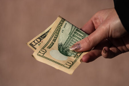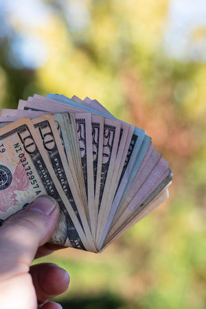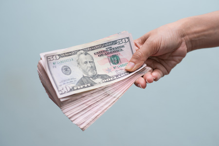 Woman hand holding and giving money. World money concept, close up of USD banknote, photo of American Dollars currency. Hand holding money, American dollars