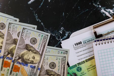 Stimulus economic tax return check and USA currency hundred US dollar bills 1040 U.S. Individual Income Tax Return