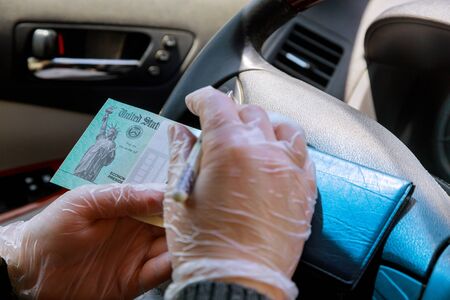 Writing on blank check to with in car with gloves on depositing government stimulus check with gloves on for safety