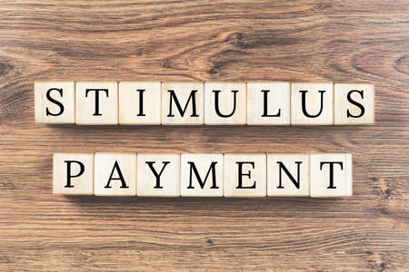 stimulus payment text on wooden blocks against textured background. Stimulus package concept