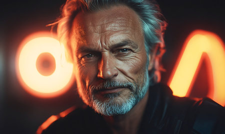 A close-up of a senior man with silver hair, standing confidently under dramatic neon lighting, showcasing experience and charisma.