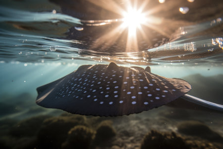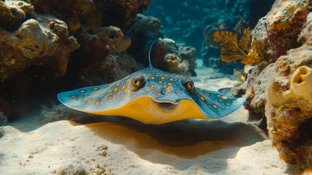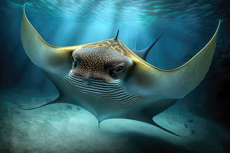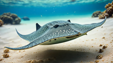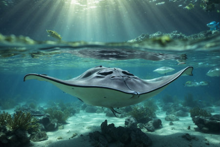 Close-up of a stingray gracefully gliding on the ocean floor, surrounded by colorful coral reefs. Sunlight creates a mesmerizing ray of light, illuminating the beauty of the underwater world.