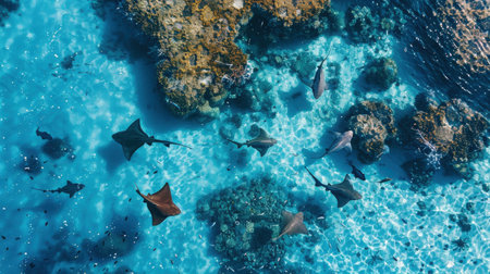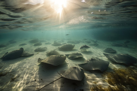 school of rays swimming together in a tranquil lagoon, created with generative ai