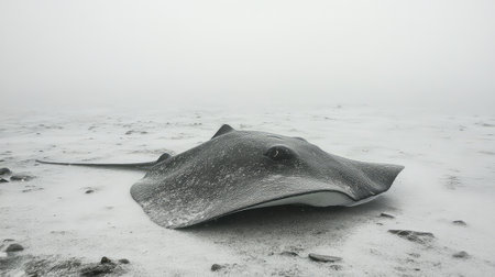 A captivating underwater image showcasing a large stingray resting gracefully on the sandy ocean floor, enveloped by a mysterious fog, creating a peaceful atmosphere.