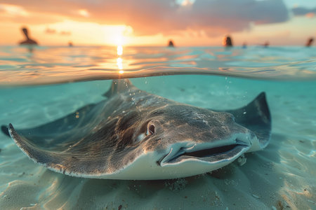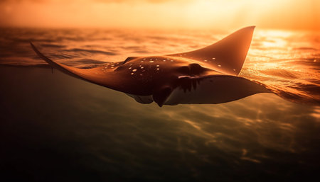 Stingray swimming in the ocean at sunset.